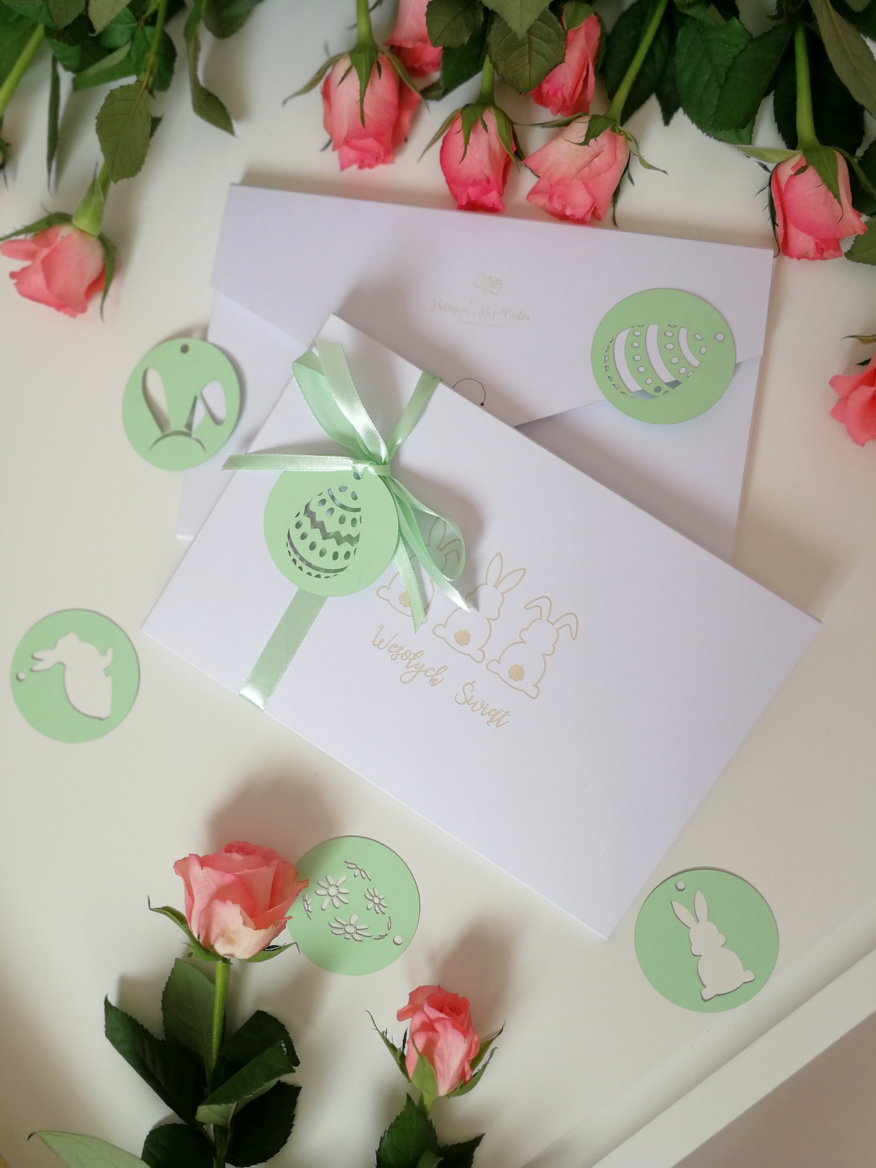 Elegancka ponadczasowa koperta Wielkanocna na zdjęcia 15/23 cm wzór 1 z ozdobną laserowo wycinaną miętową przywieszką i pastelową kokardą o grubości 7 mm wykonana z białego papieru o gramaturze 250 z grawerowaną grafiką królika.