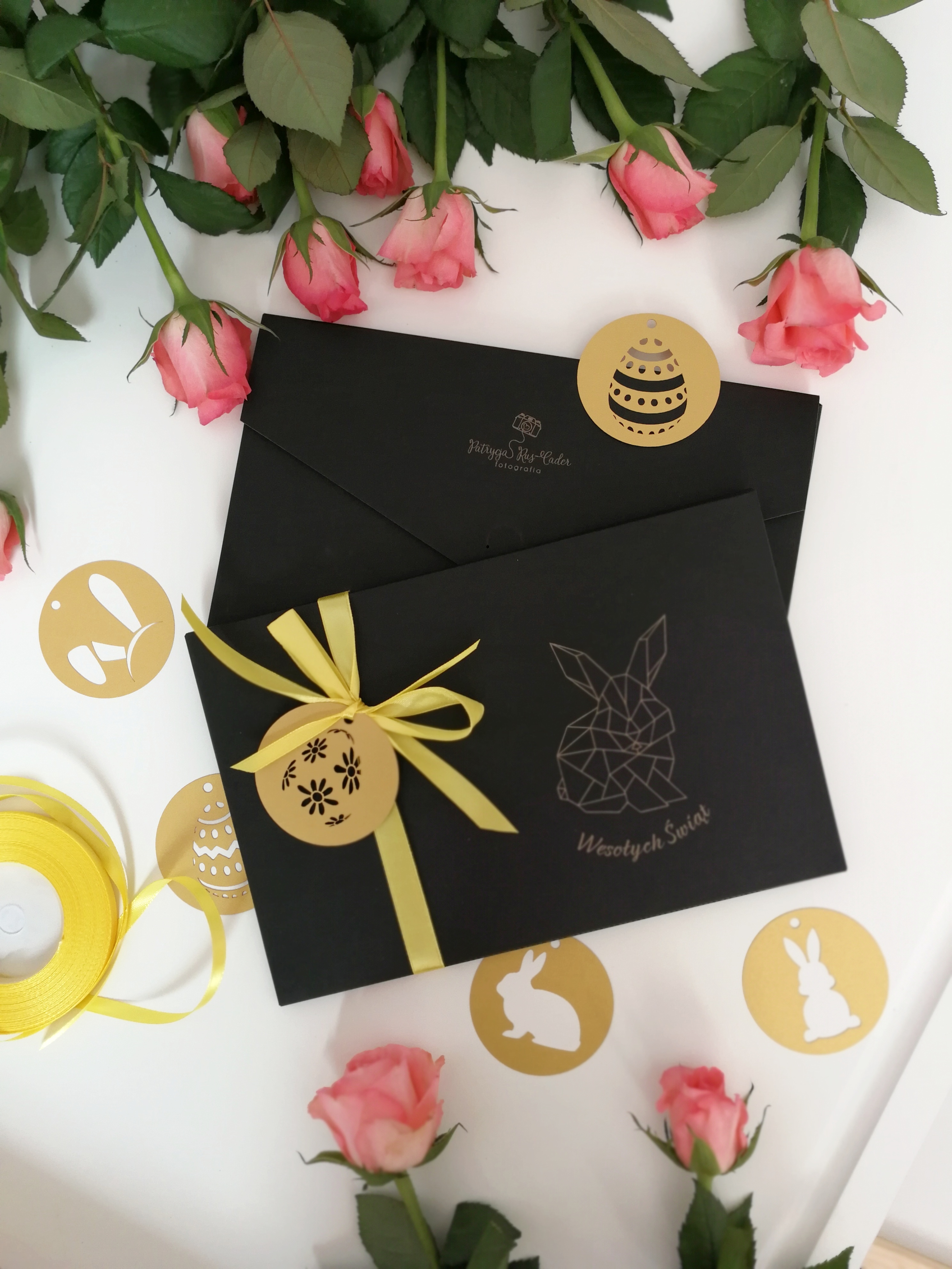 Elegancka ponadczasowa koperta Wielkanocna na zdjęcia 15/21 cm wzór 1 z ozdobną laserowo wycinaną przywieszką i satynową kokardą. Koperta o grubości 7 mm wykonana z czarnego papieru o gramaturze 250 z grawerowaną grafiką królika.