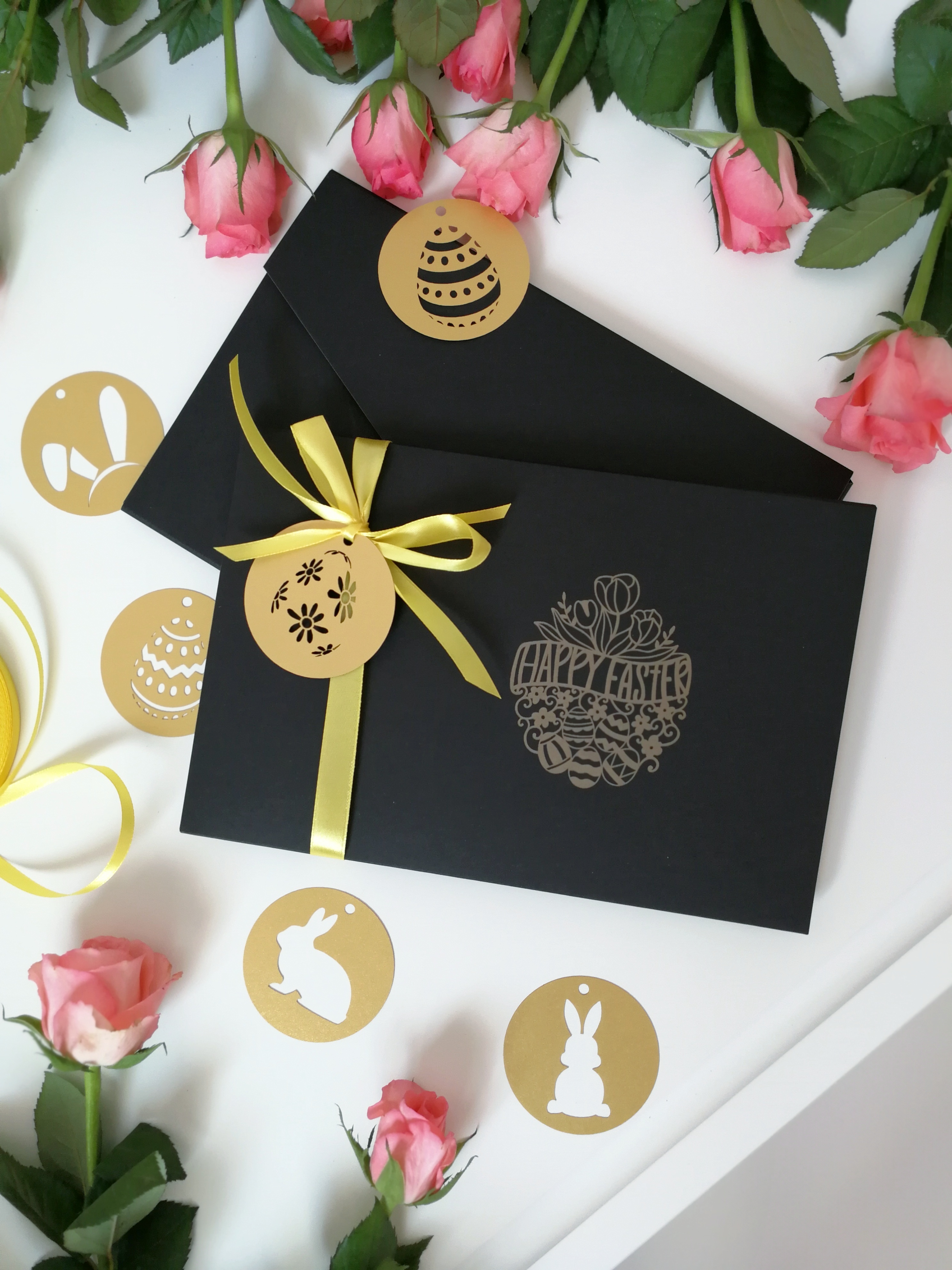 Elegancka ponadczasowa koperta Wielkanocna na zdjęcia 15/23 cm wzór 1 z ozdobną laserowo wycinaną przywieszką i satynową kokardą. Koperta o grubości 7 mm wykonana z czarnego papieru o gramaturze 250 z grawerowaną grafiką pisanek wielkanocnych.
