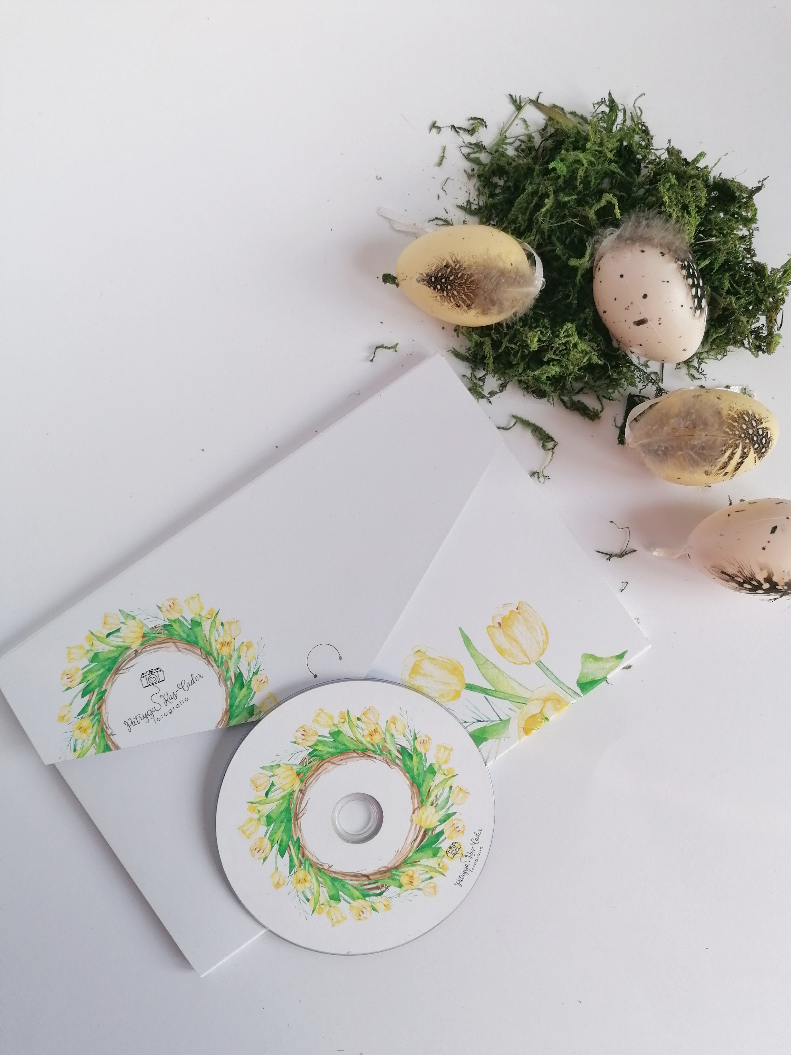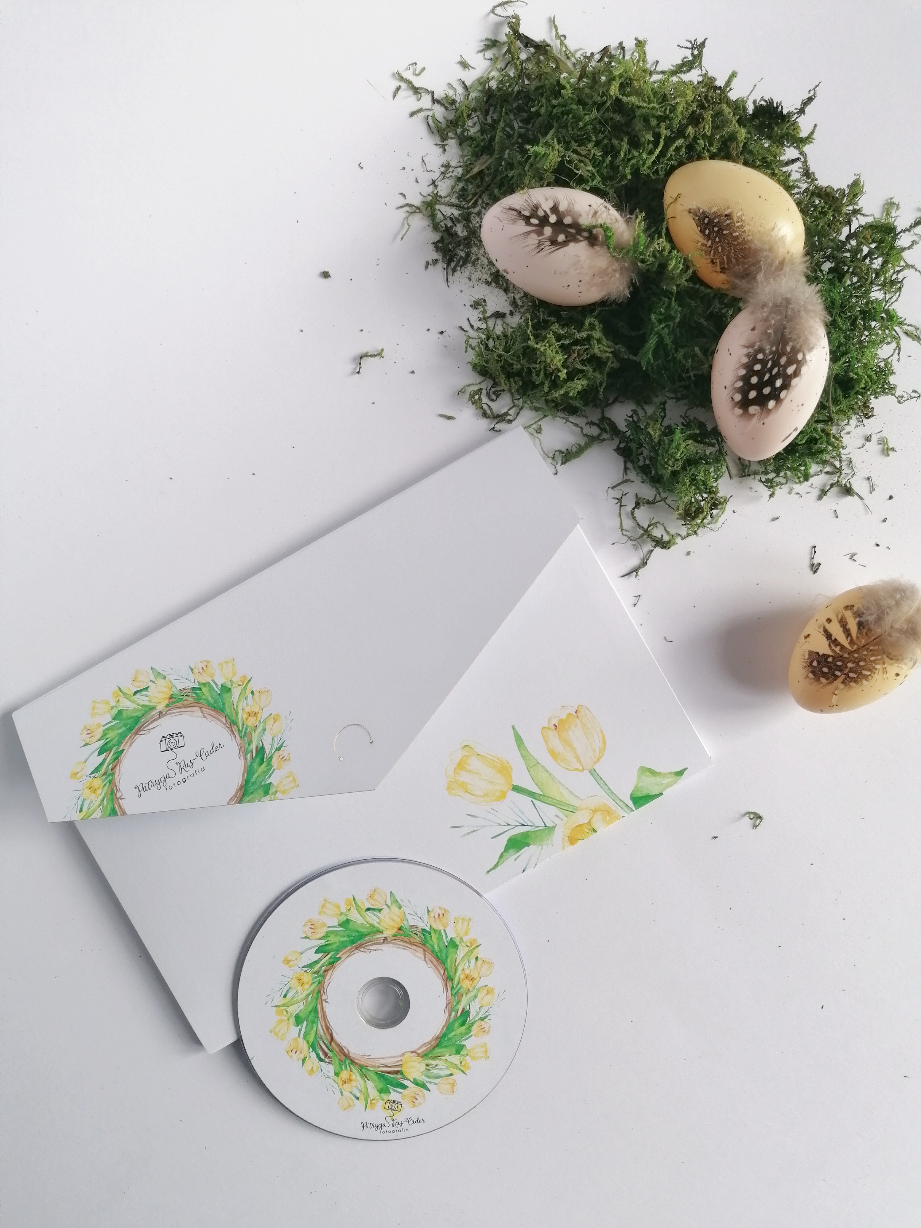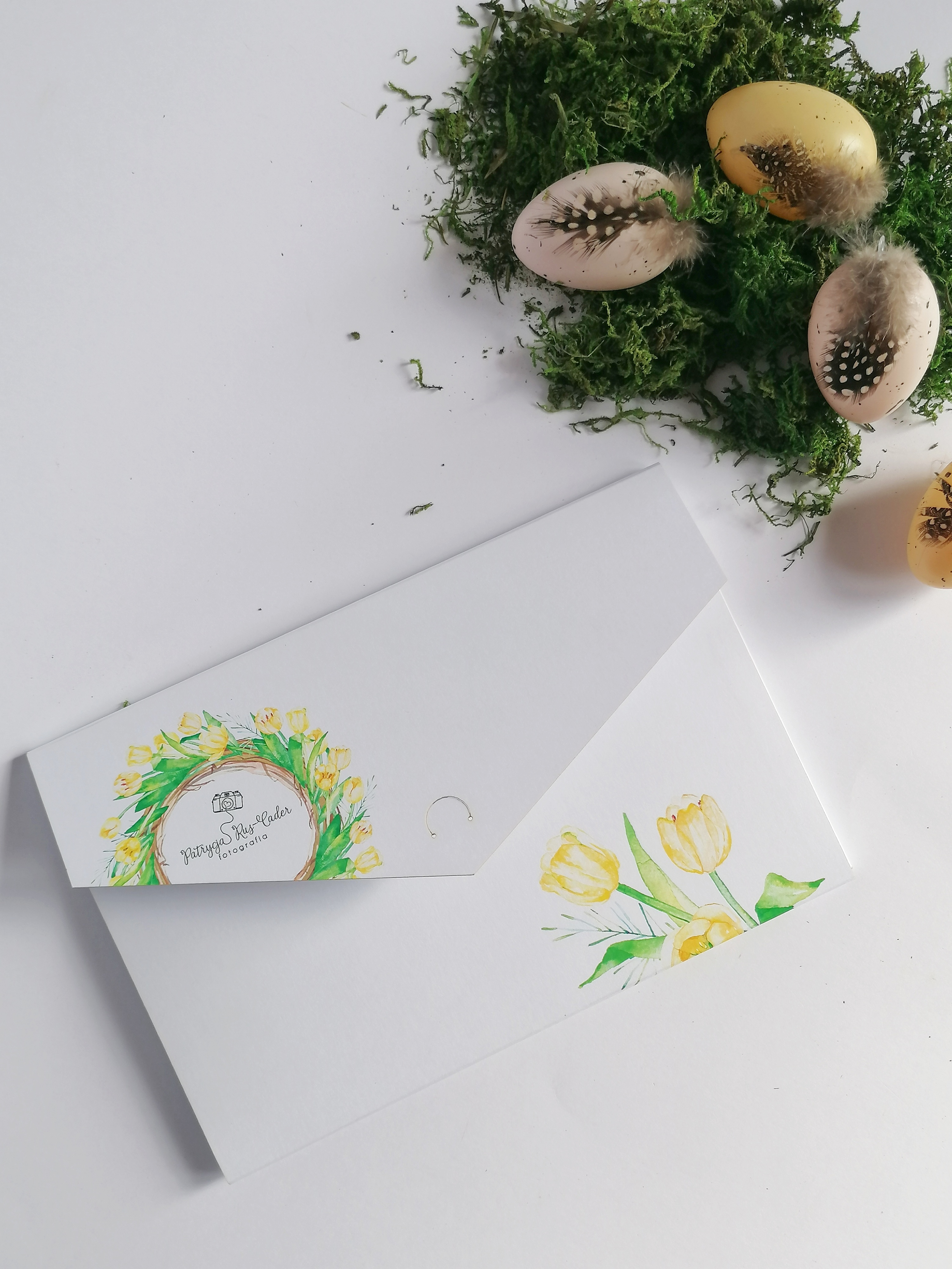 Elegancka ponadczasowa koperta na zdjęcia 15/23 cm wzór 1 o grubości 7 mm wraz z kieszonką na płytę DVD wewnątrz koperty oraz nadrukiem grafik wiosennych i logiem fotografa . Wykonana z białego papieru o gramaturze 250 gr.
