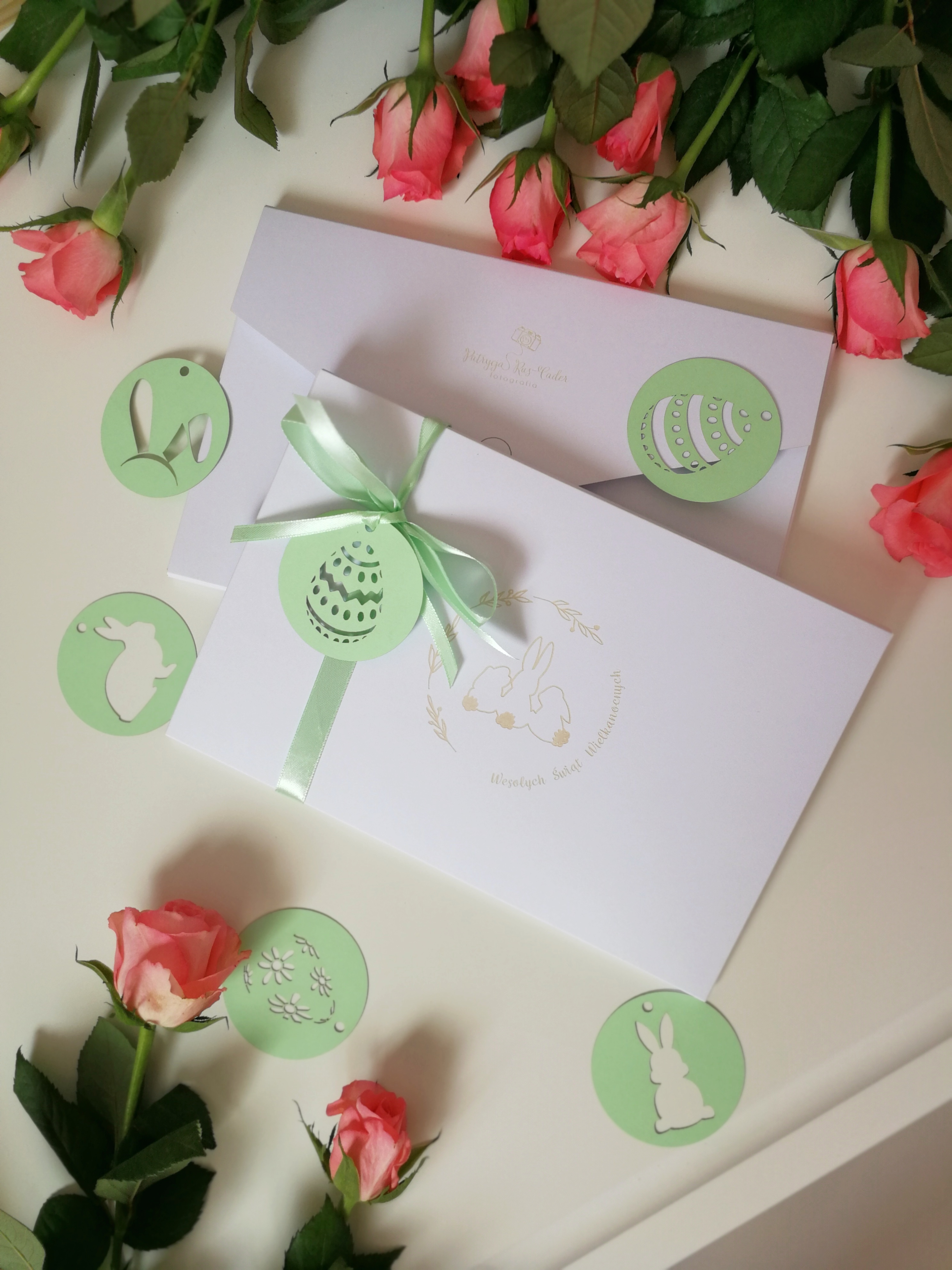 Elegancka ponadczasowa koperta Wielkanocna z kieszonką na płytę DVD na zdjęcia 15/21 cm, grawer 3 - wzór 1 z ozdobną laserowo wycinaną przywieszką i satynową kokardą. Koperta o grubości 7 mm wykonana z białego papieru o gramaturze 250 z grawerowaną grafiką królików.