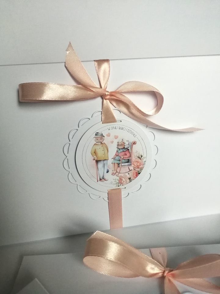 Elegancka koperta Z Okazji Dnia Dziadków na zdjęcia 15/23 cm wzór 3 o grubości 7 mm wykonana z białego papieru o gramaturze 250 gr . Koperta z ozdobną kokardą i elementami drukowanymi , złożona z zamknięciem.