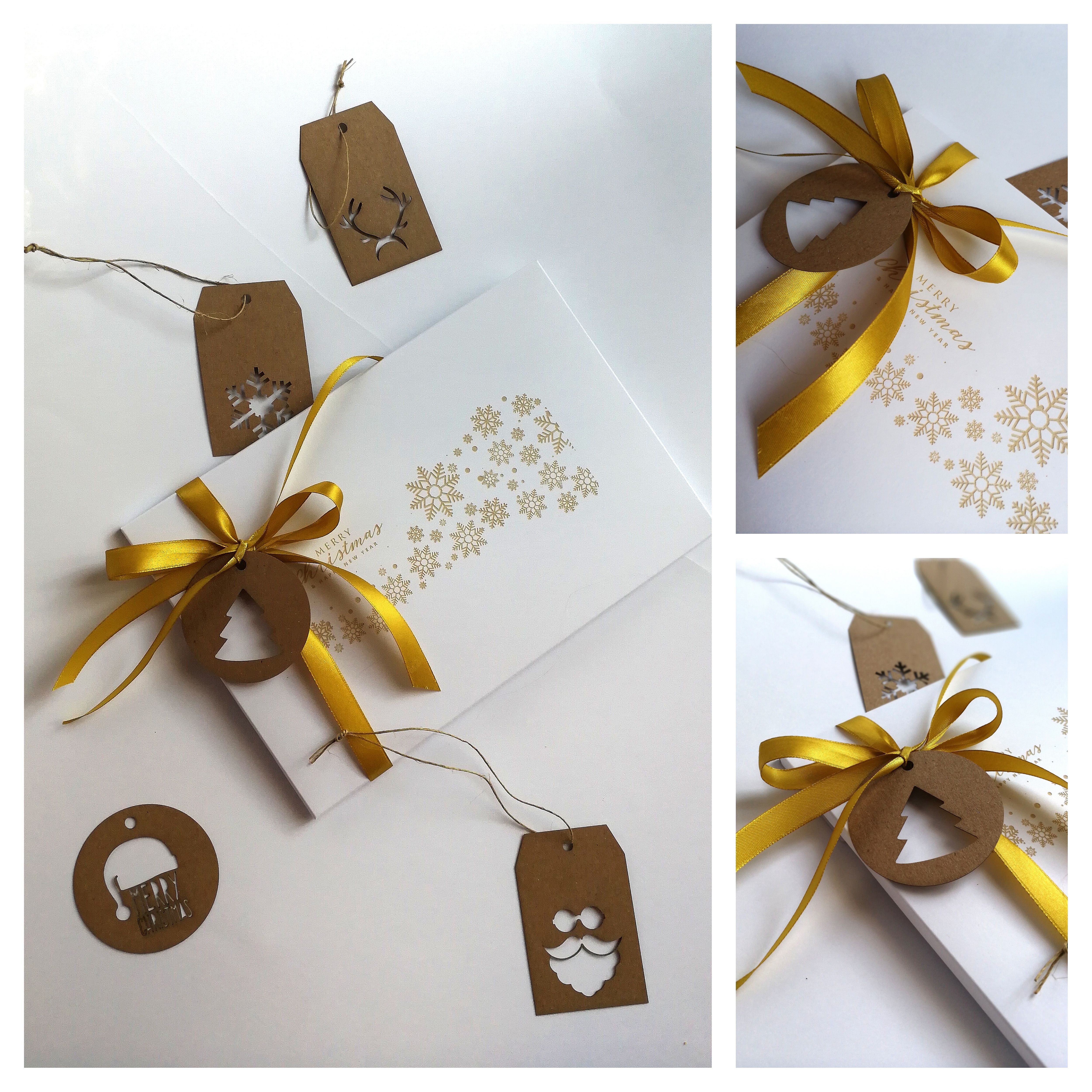 Elegancka ponadczasowa koperta świąteczna z przywieszką i ozdobną kokardą wzór 1 na zdjęcia 15/21 cm o grubości 7 mm wykonana z białego papieru  o gramaturze 250 z motywem świątecznego graweru. Koperta dostępna w jednej z 12 konfiguracji graweru widocznym na zdjęciach produktu.