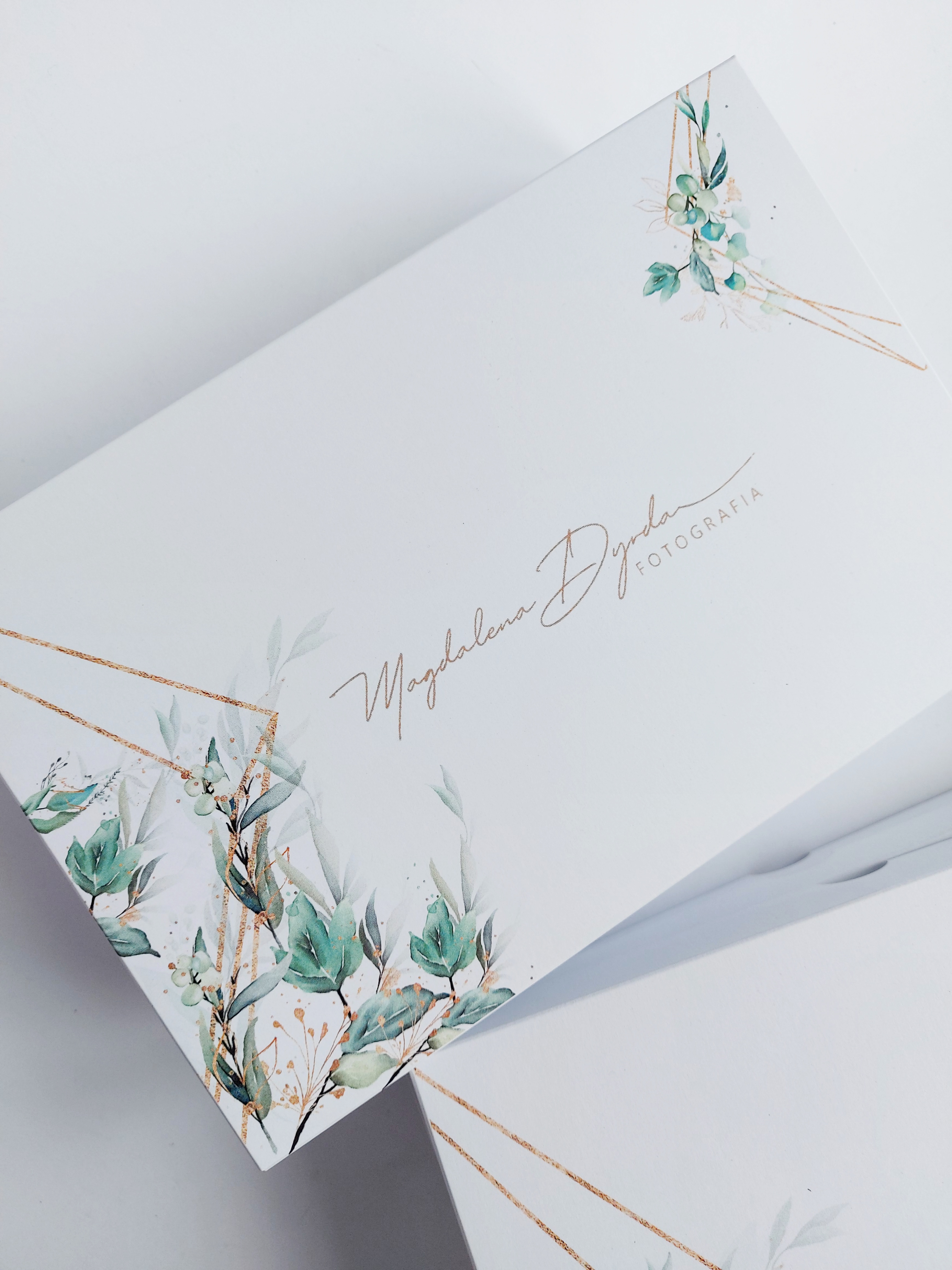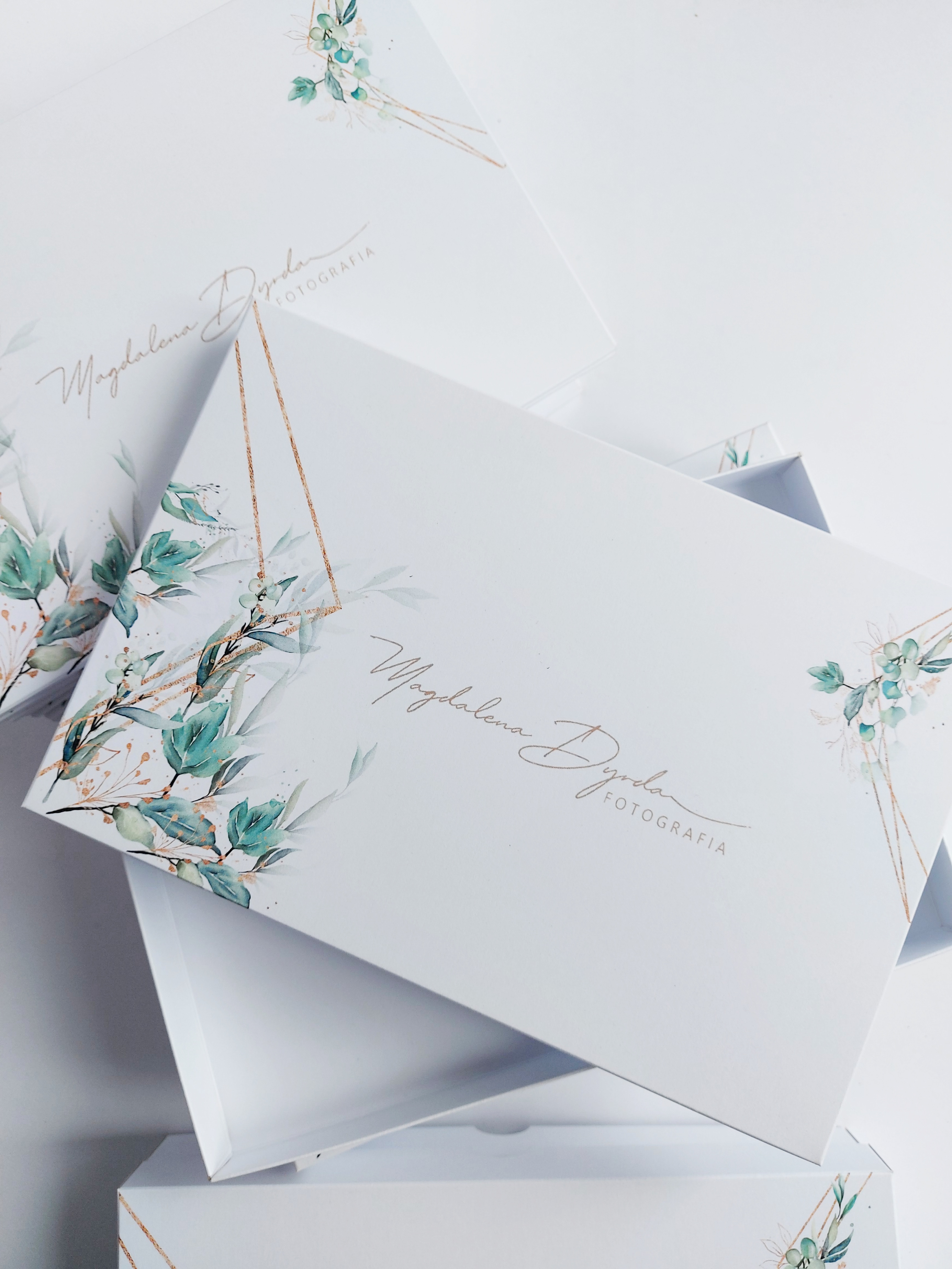 Eleganckie, ponadczasowe pudełko na zdjęcia 13/18  wykonane z  białego papieru 300 gr  z wiosenną grafiką  i logiem fotografa