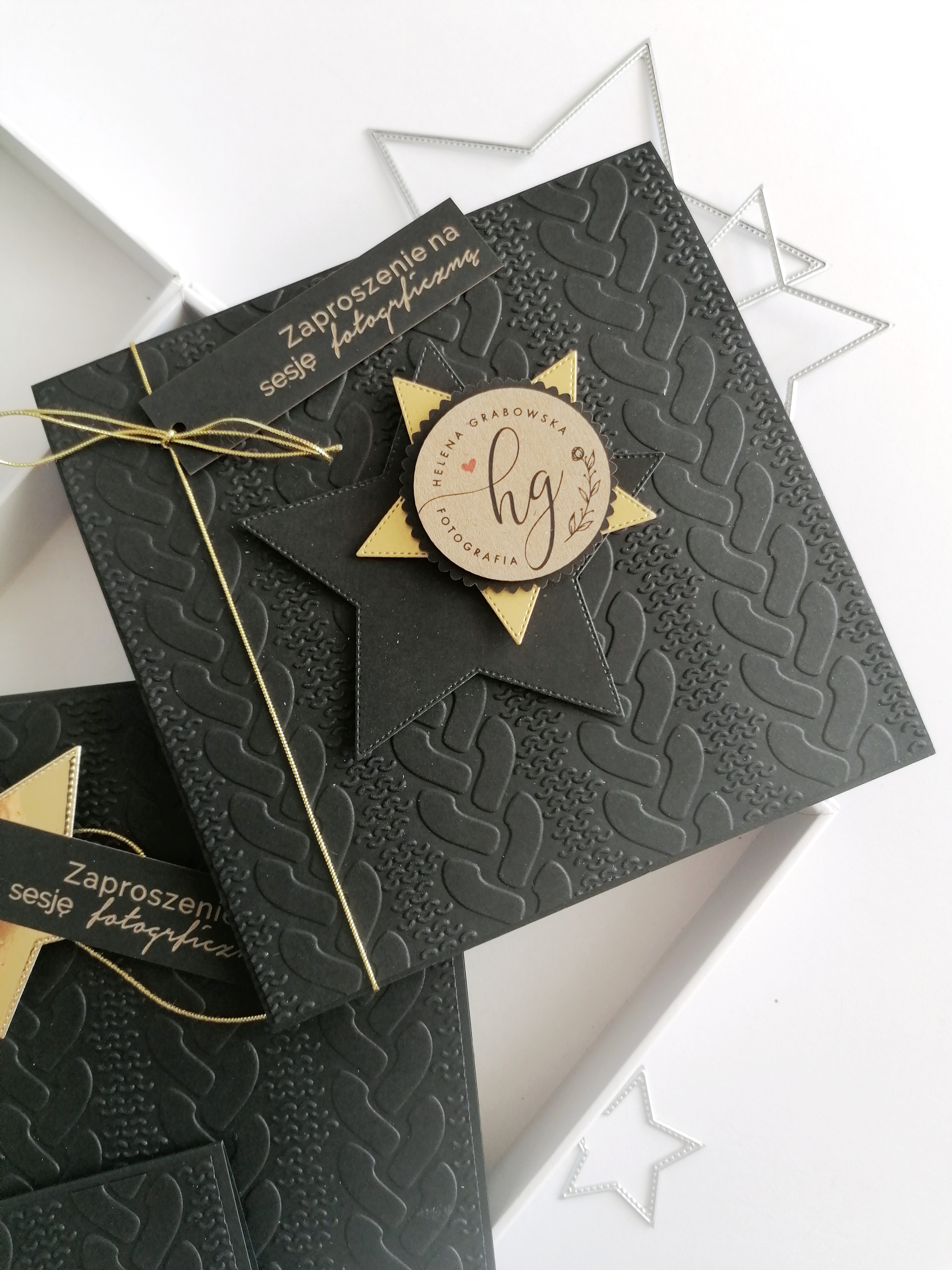 Zaproszenie na sesję fotograficzną wraz z białą kopertą. Zaproszenie wykonane z papieru czarnego 320 gr .