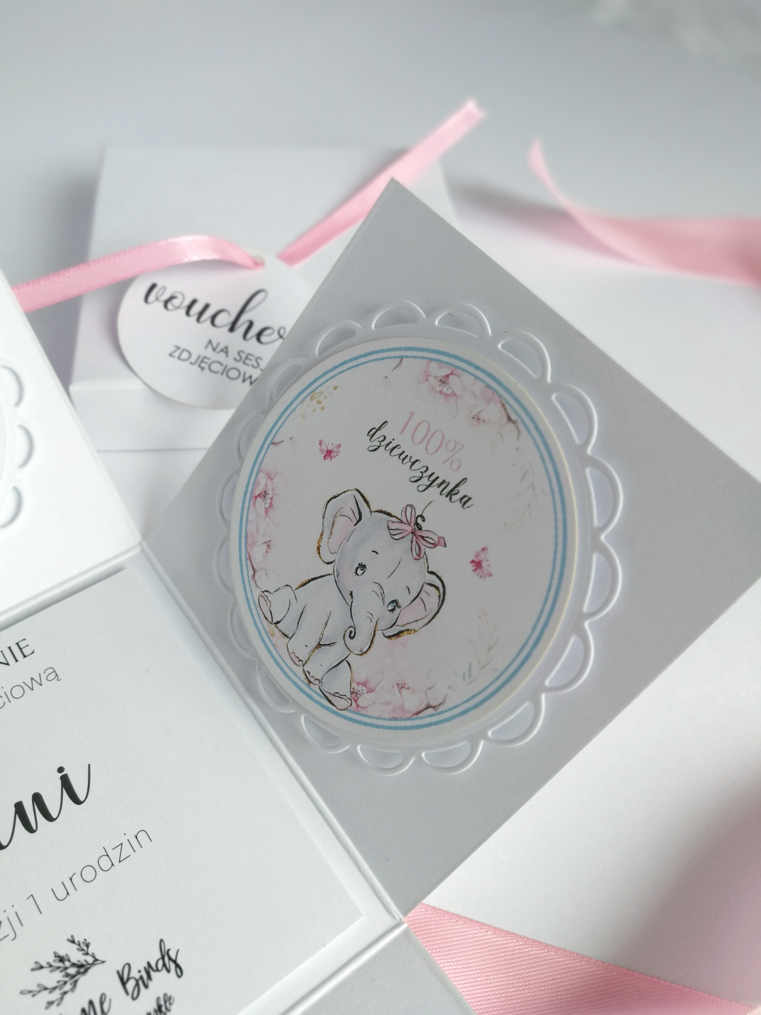Na ściankach boxu ozdobne grafiki na roczek, zaś dno personalizowane .  Całość przewiązana jest różową wstążką z kokardą i przywieszką.